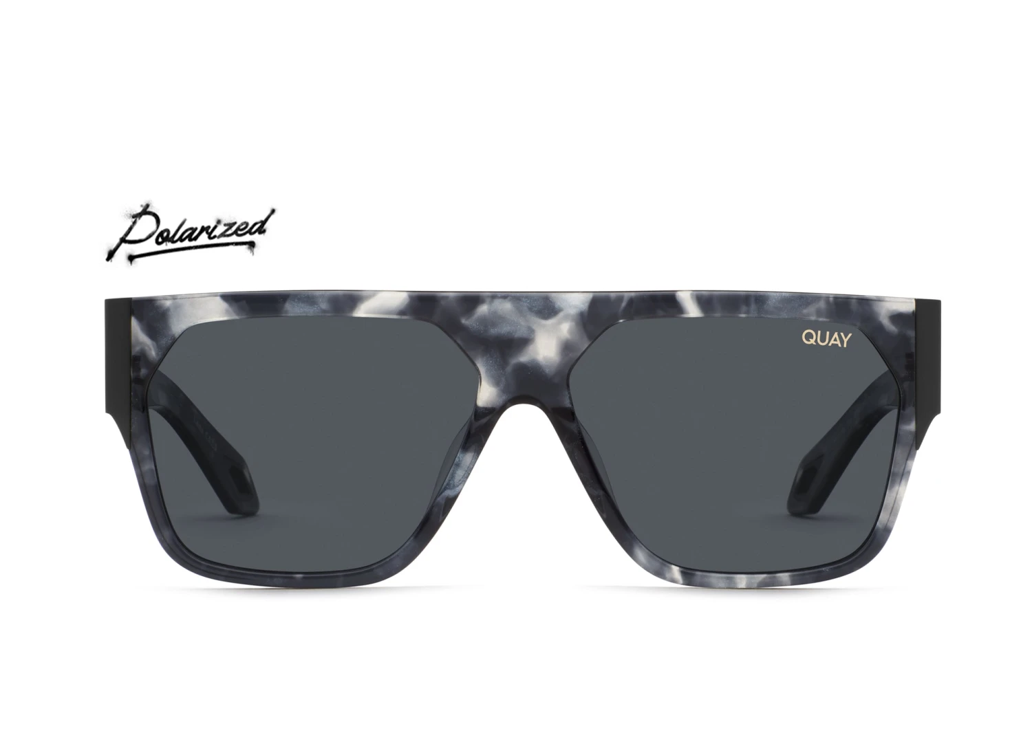 Two words: GO OFF. This luxe shield is worth the hype. It features a flat top, acetate frame with gold accents like the lens logo, cut-out details, and POLARIZED lenses to reduce glare + improve clarity at all the bright times.