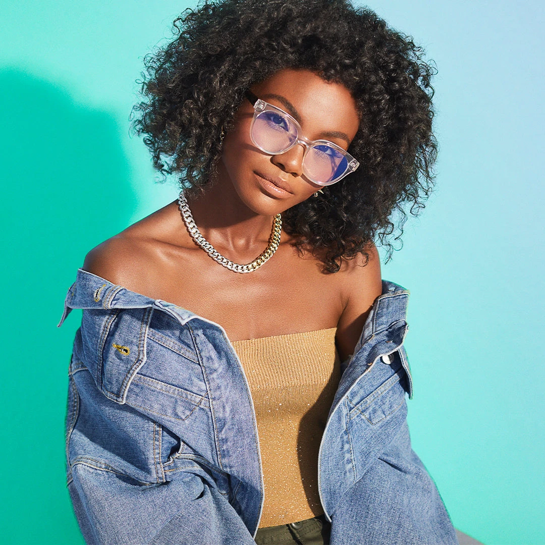 Hit ‘em with a FOLLOW BACK. This rounded, injection cat eye features a clear frame front with contrast tort temples. Prescription glasses with serious specs appeal.
